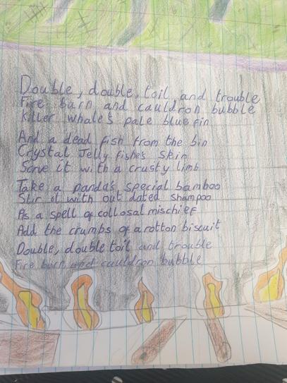 The children in Dosbarth Gwynno have been studying the children’s play ‘Macbeth’ by William Shakespeare. They have been learning about alliteration, rhyming couplets and syllables and how these vehicles of writing inform the ‘Witches Spell’ in Shakespeare’s play. The children have analysed the extract form the play below. Their next task was to work collaboratively and create a series of ingredients to create their own piece of poetry writing. Please find examples of their poetry ideas below.