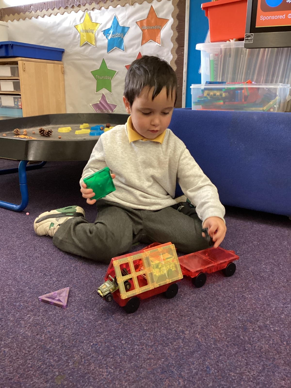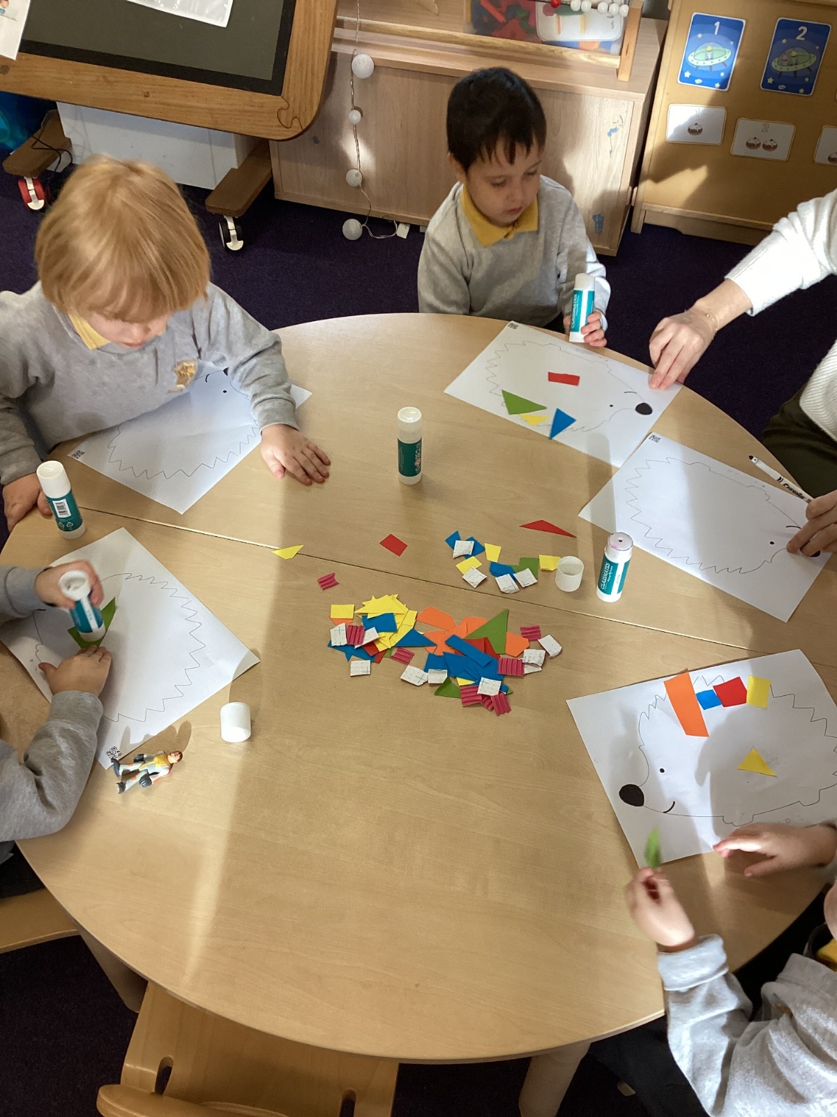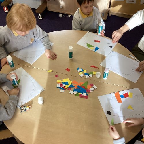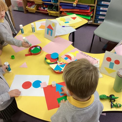 In maths, we have been using 2D shapes to create familiar pictures. During this exercise, we also practise using a glue stick to paste.