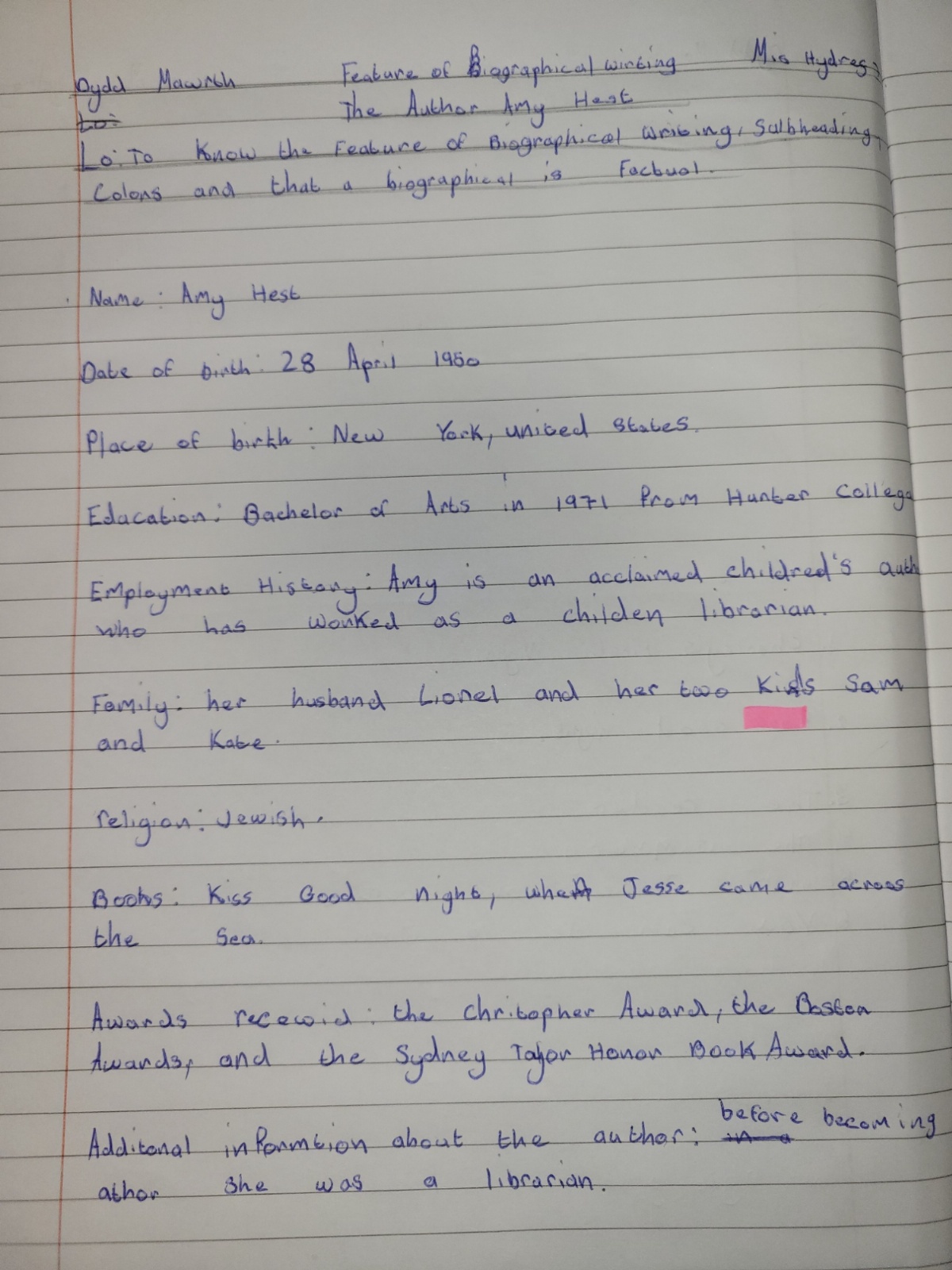 Most children have learnt multiplication facts to six and to ten. They are doing BRILLIANTLY! They understand how to find the product, the multiples, recognise whether a number is odd or even and to square numbers within the six and ten times table.. The topic on place value is coming to an end and next week children will commence a new numeracy topic on factions. Knowing your table is key to this. An example of learning will be using tables to answer. For example, a quarter of 16 is - 16 divided by four. Older children will develop this numeracy skill to know what three quarters of sixteen is. Children have to develop their mental recall of multiplication facts themselves, but it will enhance their mathematics skills enormously and help them to engage in reasoning tasks enormously. The children have had up to three spelling tests on differentiated common usage spellings this week and know their scores. They have conducted inference questions on our writing Journey text, which is a key literacy skill for the summer reading assessments. Again, many thanks to the parents who are coming in to support less fluent readers. It is much appreciated, and please do not hesitate to come in to support this. It would be much appreciated. I have attached an example of work by the author, Amy Hest the writer of 'When Jessie crossed the sea.' The children have learnt that a biography is factual, the use of colons and subheadings,