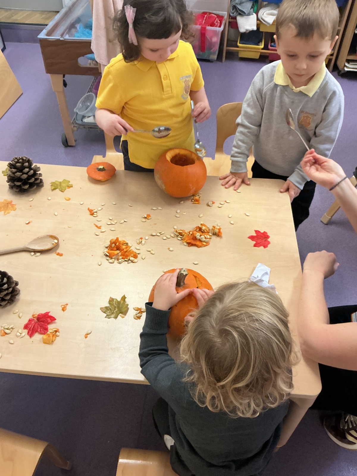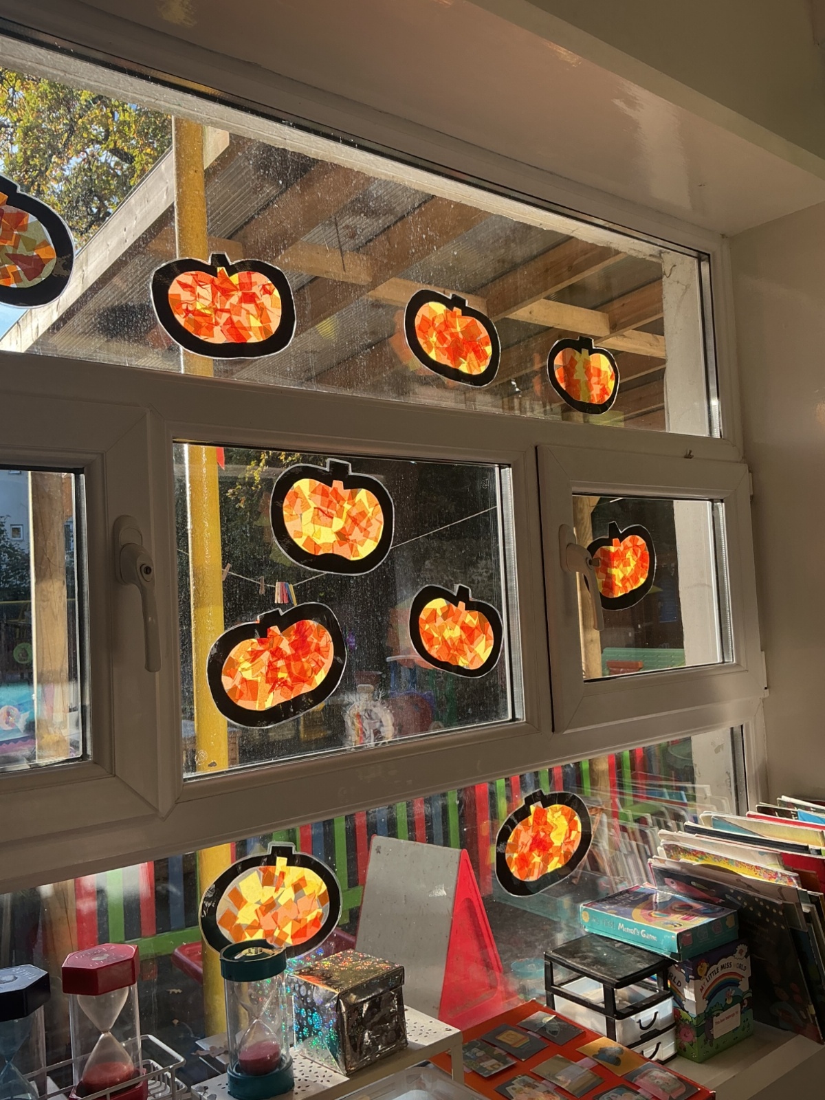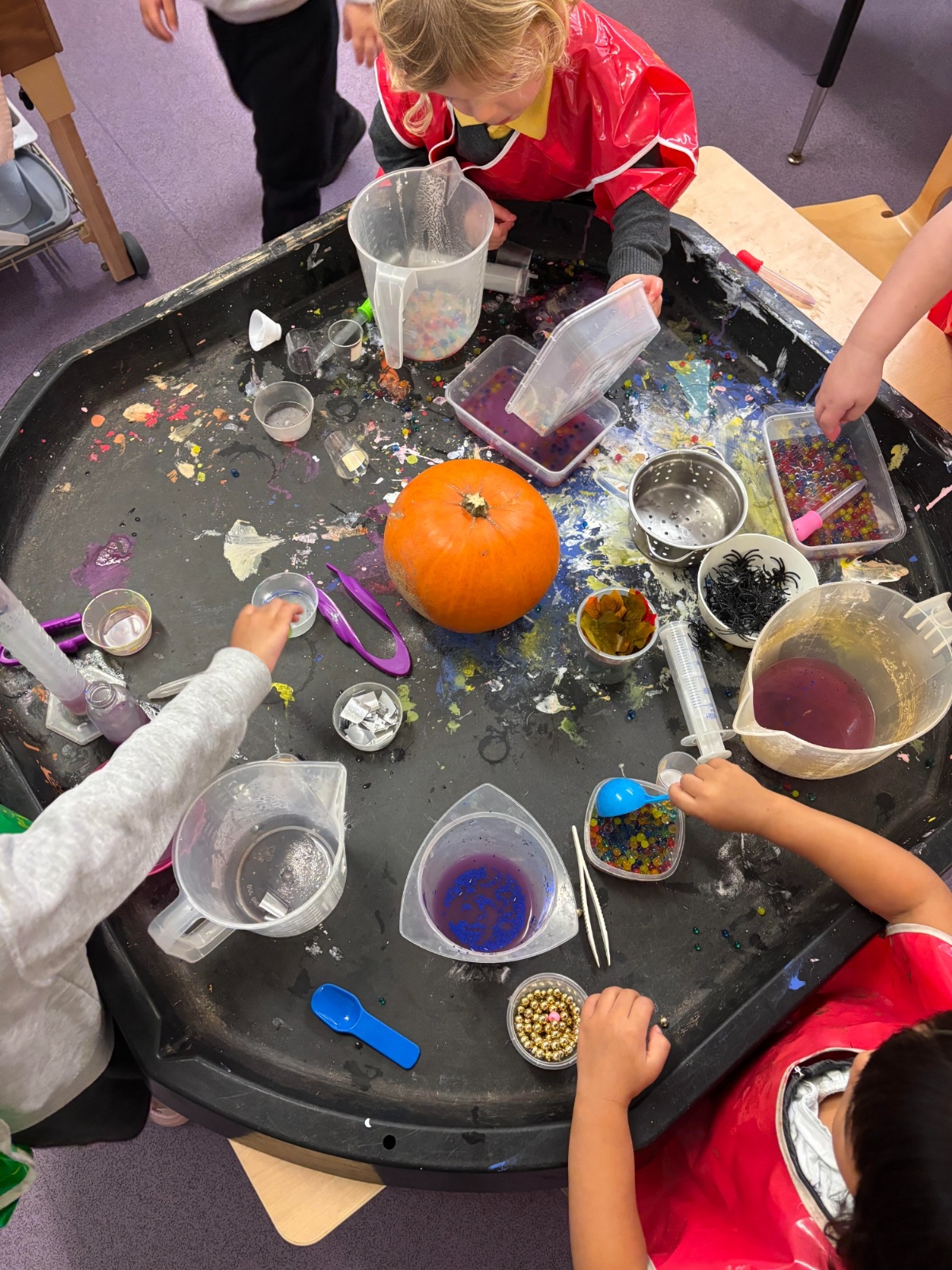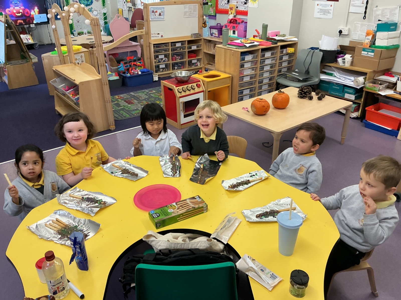 This week's storybook focus was "Room on the Broom!" Leading up to the Autumn disco, Miss Horner and Mrs. Bowen were in the mood for pumpkins, bugs and spiders! Our water tray was transformed into a gooey, gelly mess full of bugs for us to explore, and we practised matching numbers to their value with our spiderweb tuff tray! We made some lovely stained glass pumpkins for our windows and even explored real pumpkins with our senses: how they feel, smell and look! We talked about how each one of the seeds could become its own pumpkin one day. To finish this half-term off, we made some chocolate magic wands, just like the one in our story out of breadsticks and chocolate.