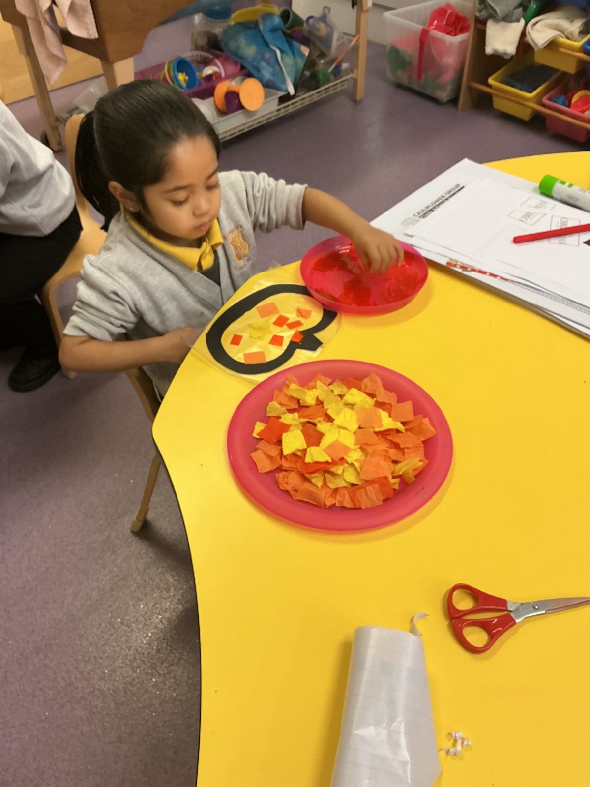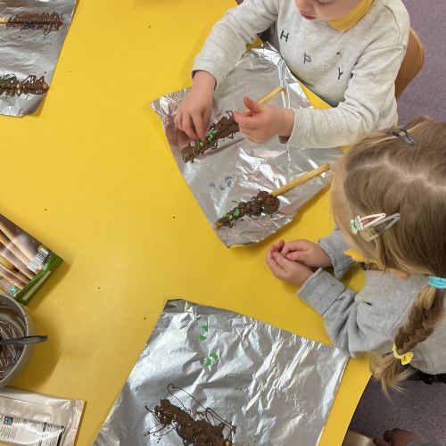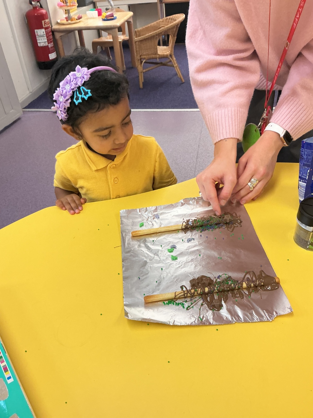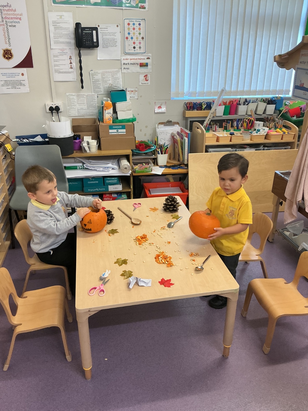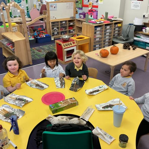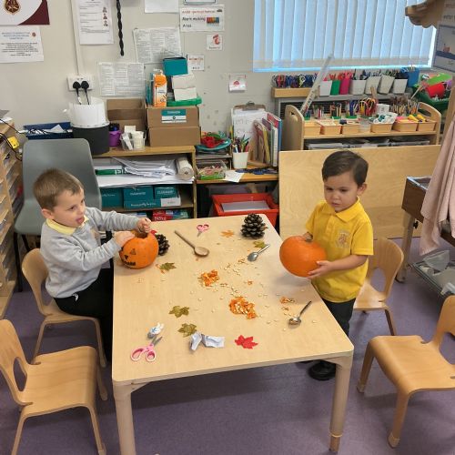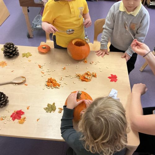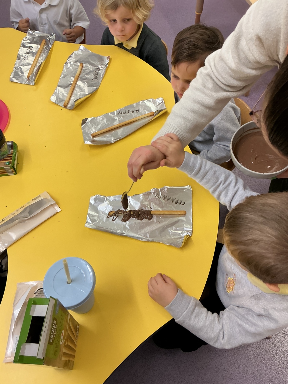 This week's storybook focus was "Room on the Broom!" Leading up to the Autumn disco, Miss Horner and Mrs. Bowen were in the mood for pumpkins, bugs and spiders! Our water tray was transformed into a gooey, gelly mess full of bugs for us to explore, and we practised matching numbers to their value with our spiderweb tuff tray! We made some lovely stained glass pumpkins for our windows and even explored real pumpkins with our senses: how they feel, smell and look! We talked about how each one of the seeds could become its own pumpkin one day. To finish this half-term off, we made some chocolate magic wands, just like the one in our story out of breadsticks and chocolate.