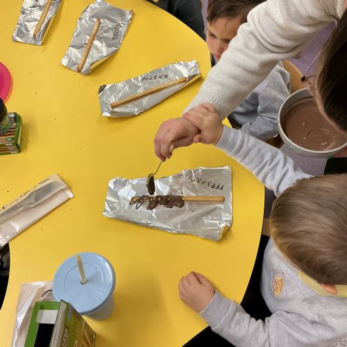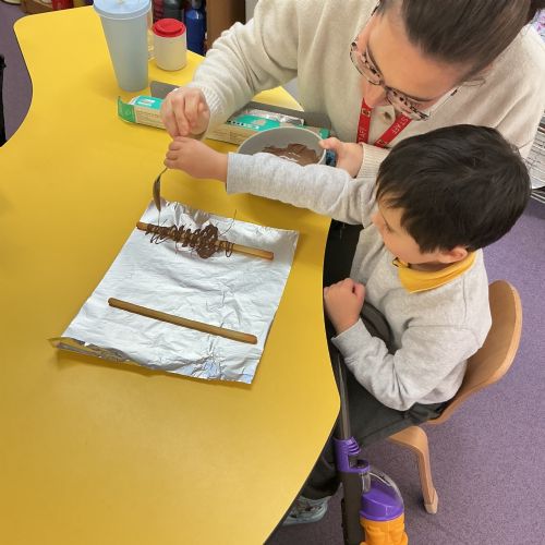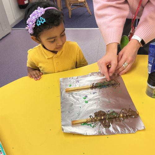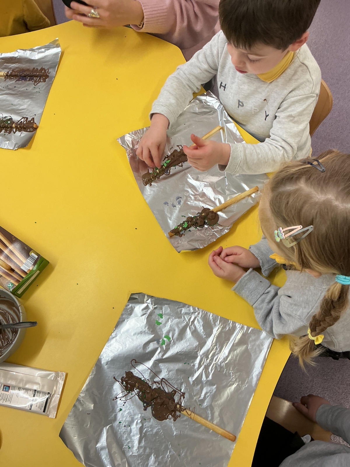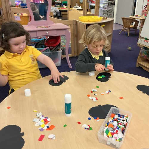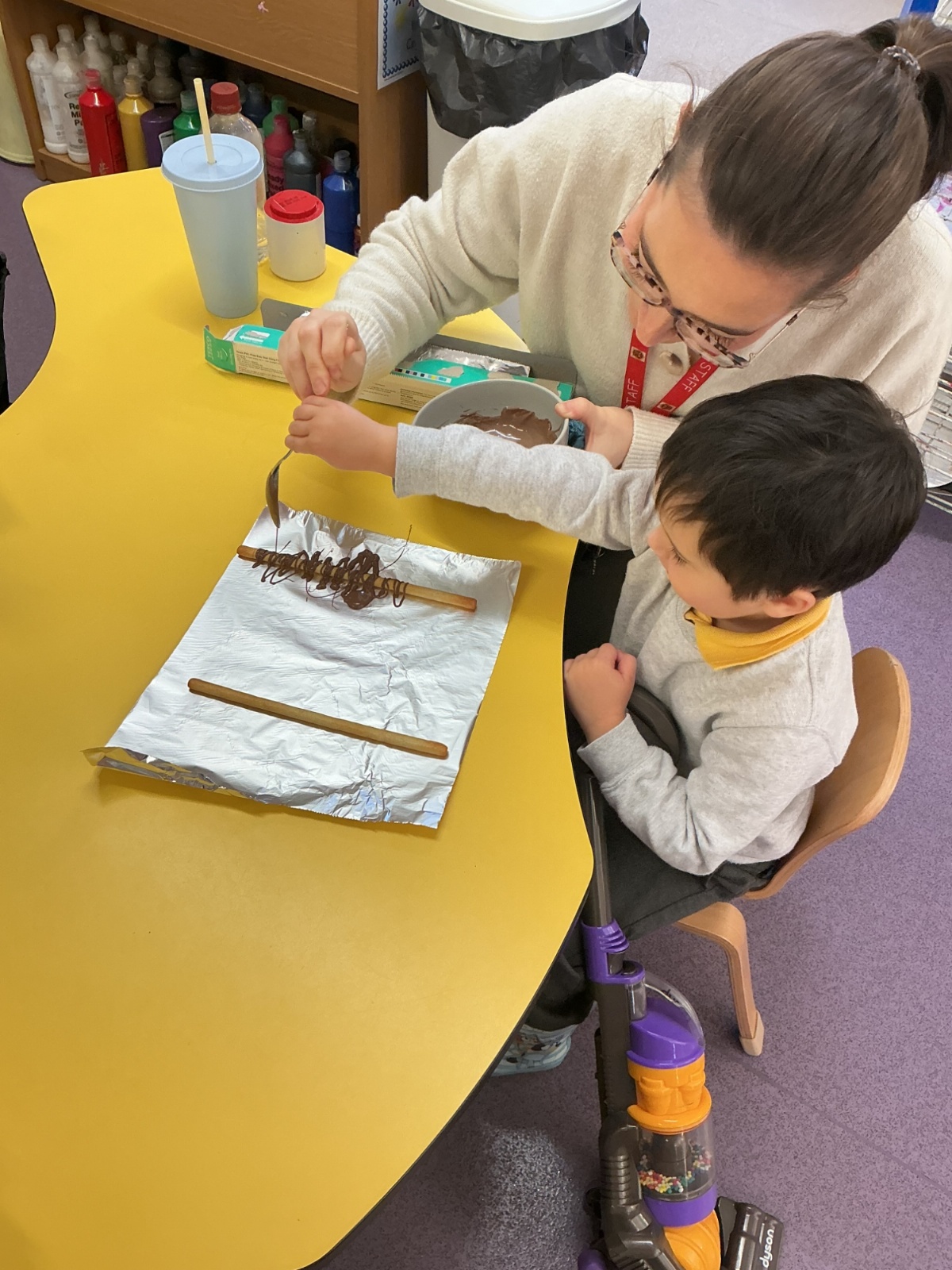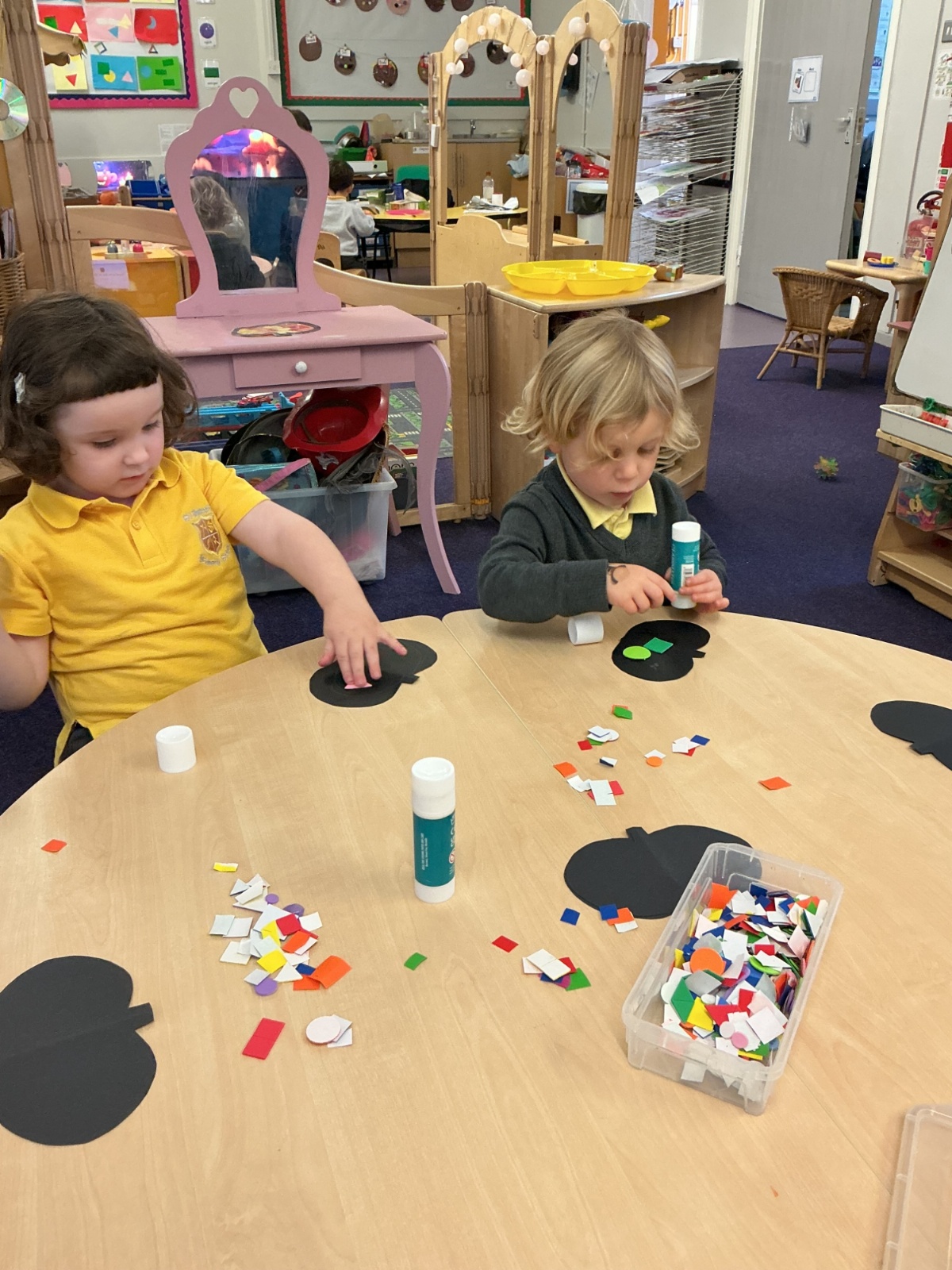 This week's storybook focus was "Room on the Broom!" Leading up to the Autumn disco, Miss Horner and Mrs. Bowen were in the mood for pumpkins, bugs and spiders! Our water tray was transformed into a gooey, gelly mess full of bugs for us to explore, and we practised matching numbers to their value with our spiderweb tuff tray! We made some lovely stained glass pumpkins for our windows and even explored real pumpkins with our senses: how they feel, smell and look! We talked about how each one of the seeds could become its own pumpkin one day. To finish this half-term off, we made some chocolate magic wands, just like the one in our story out of breadsticks and chocolate.