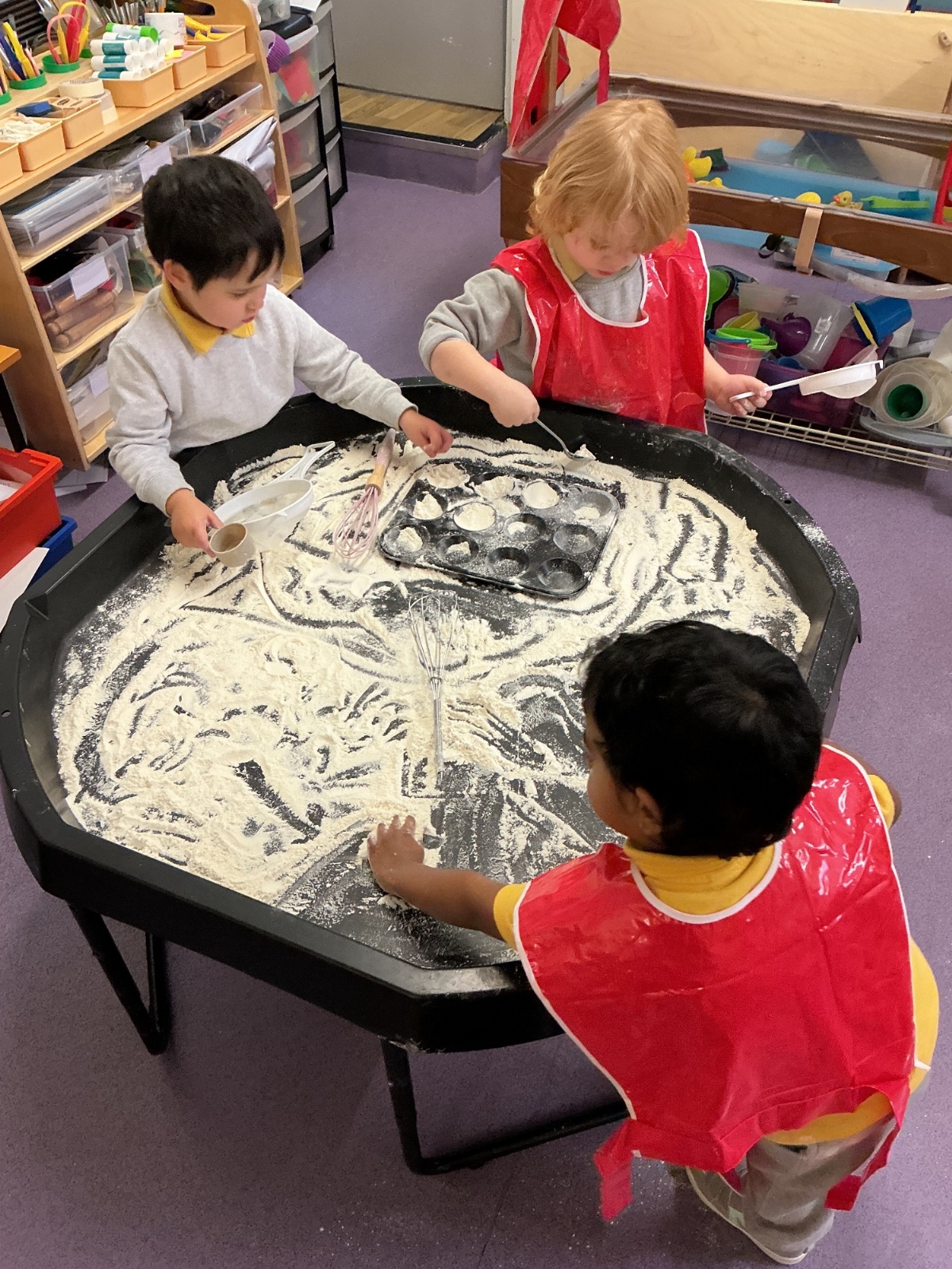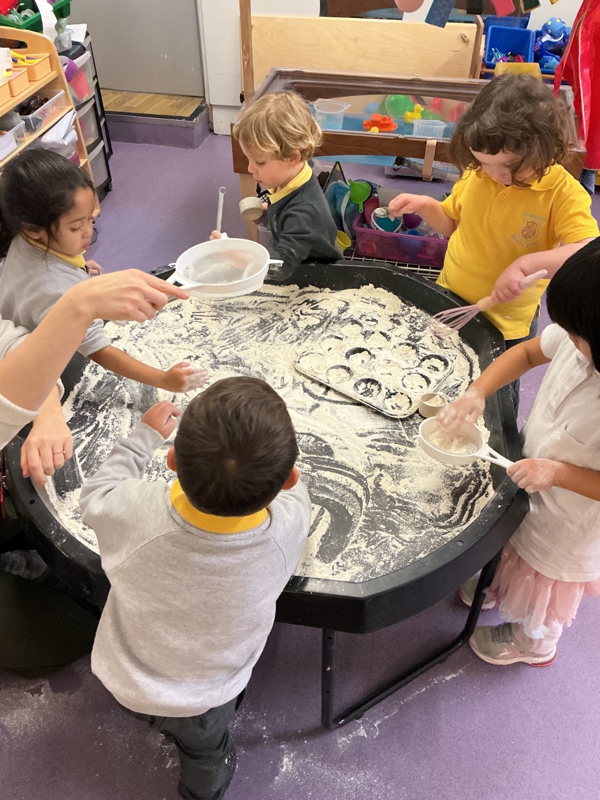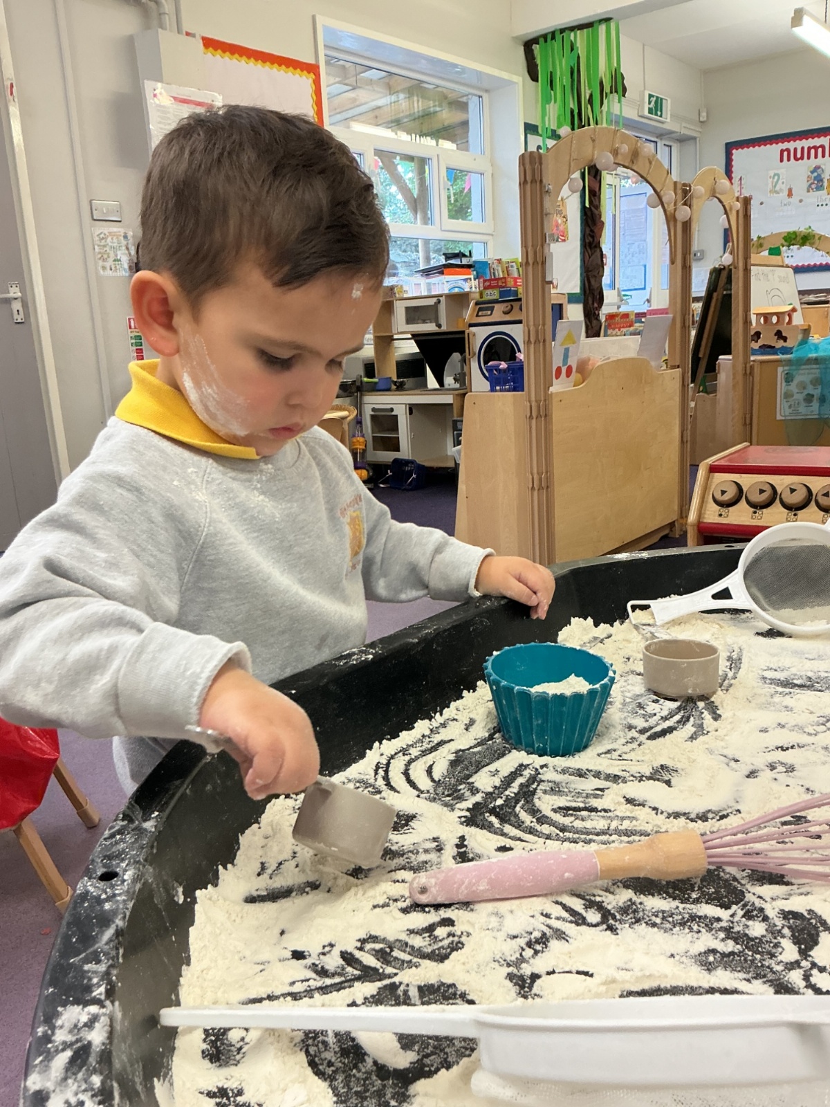 As we had Advent and Remembrance Day to learn about this week, we did not have a specific storybook focus. Instead, we read and watched multiple stories about both. We made poppies, drew Advent wreaths in our books, made some to take home and worked together to experiment with colour mixing! We also got messy by mixing, measuring, pouring and sifting flour in our baking Tuff Tray.