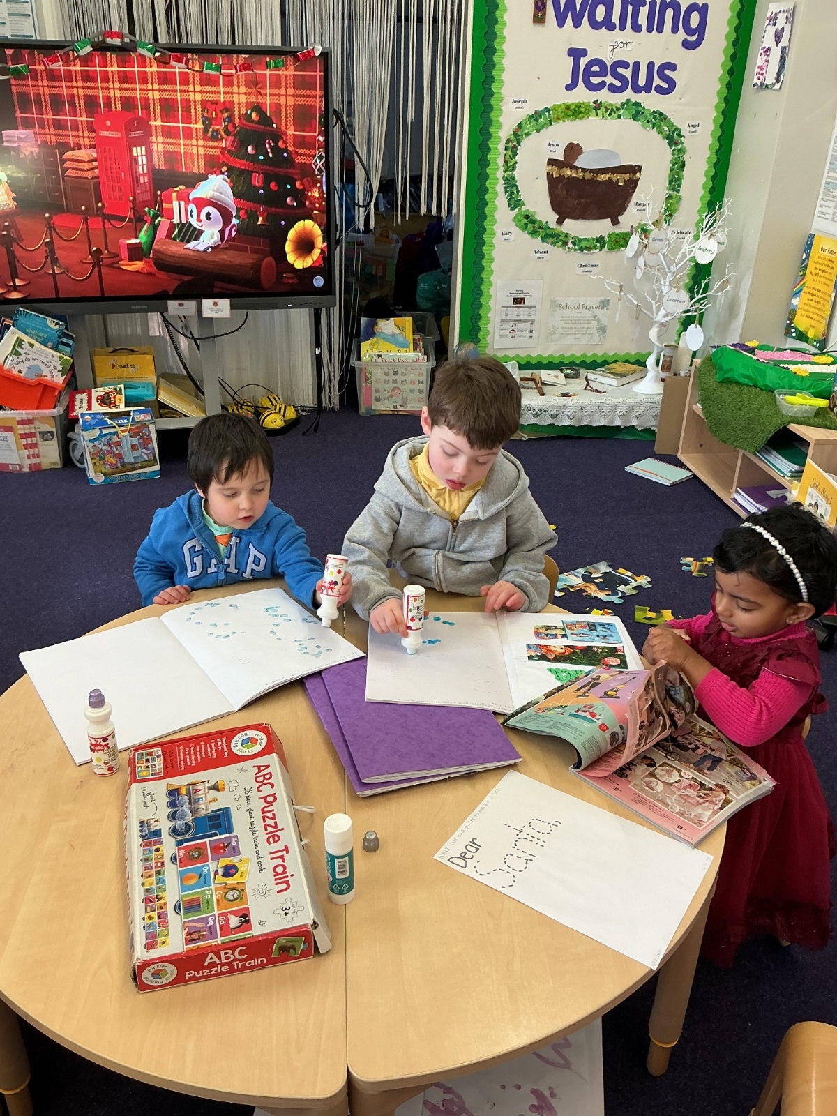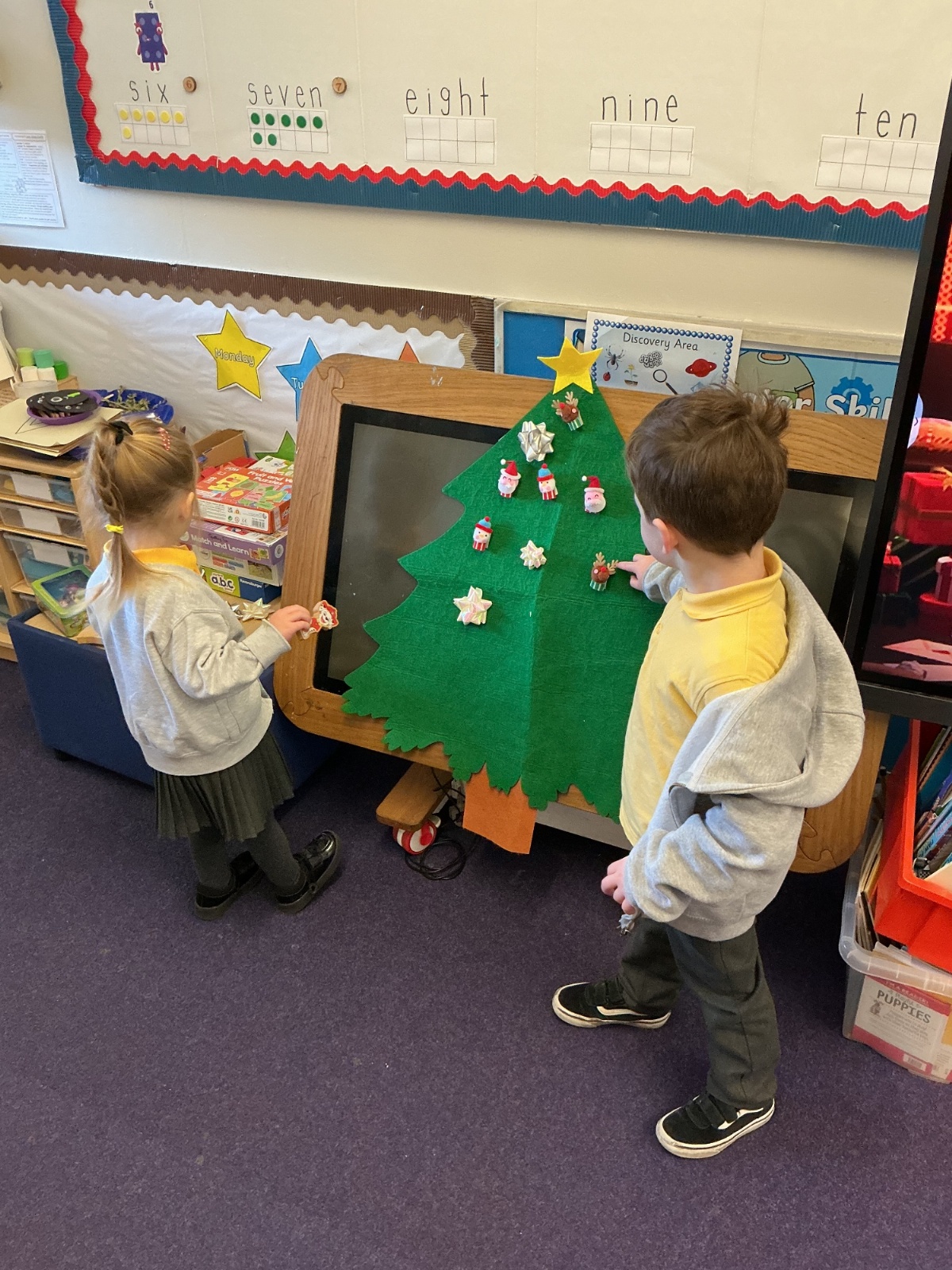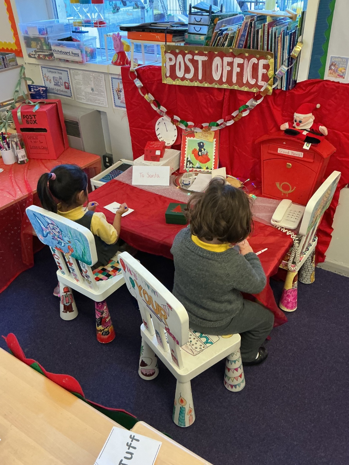 Our storybook focus this week was "The Jolly Christmas Postman!" The story really came to life because over the weekend an elf created a real post office in our classroom! It has been so fun writing and posting letters, and we especially love the stamps. This has helped us to work on our pencil grip, fine motor skills, role play and imaginary play skills. There are also so many new Christmassy things in our classroom like a Christmas tree and wreath we can decorate. Our messy Tuff Tray tested our fine motor skills too, we had to use tweezers to pull snowball pom poms off of tape.