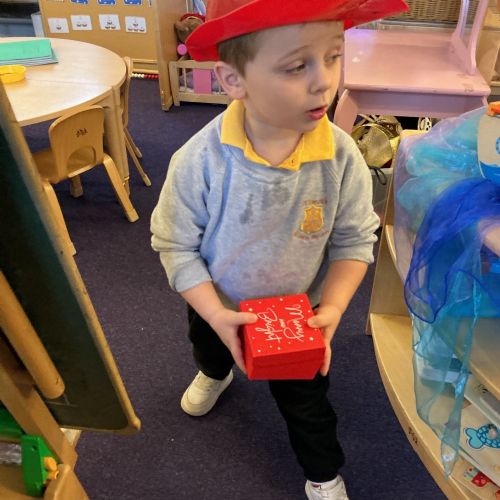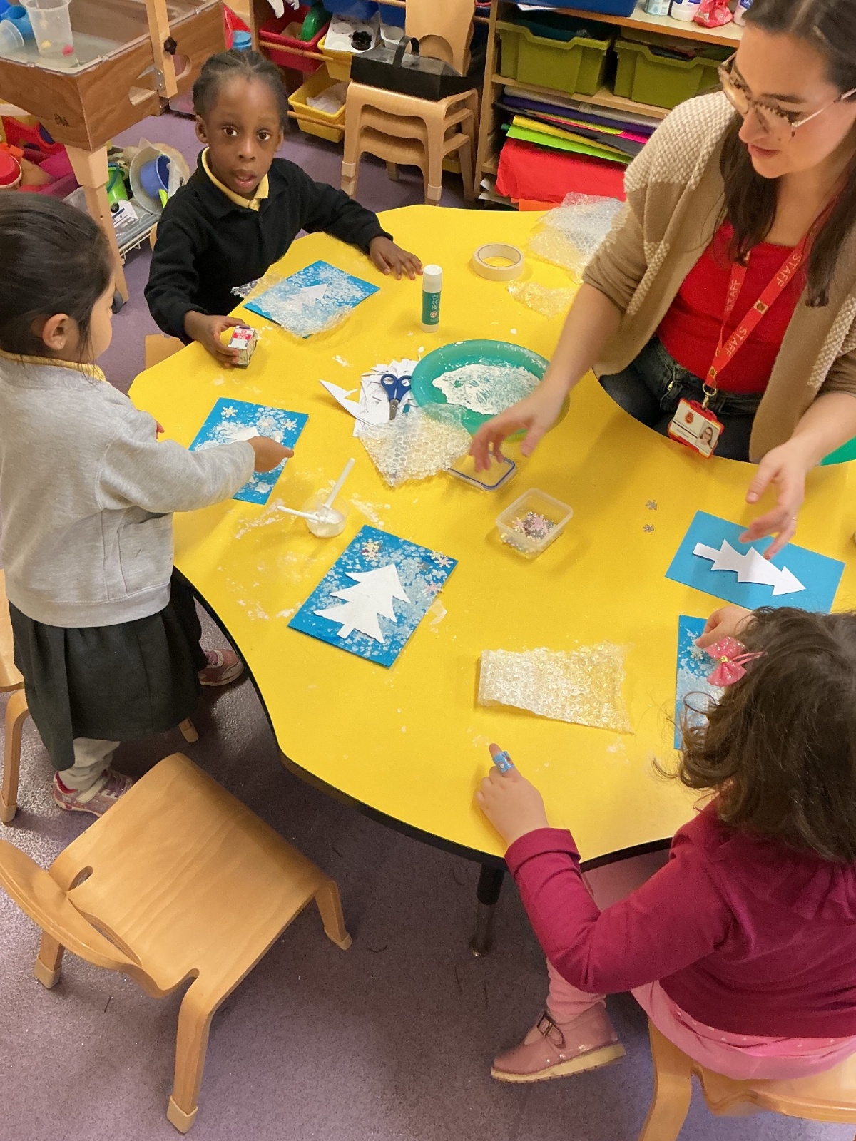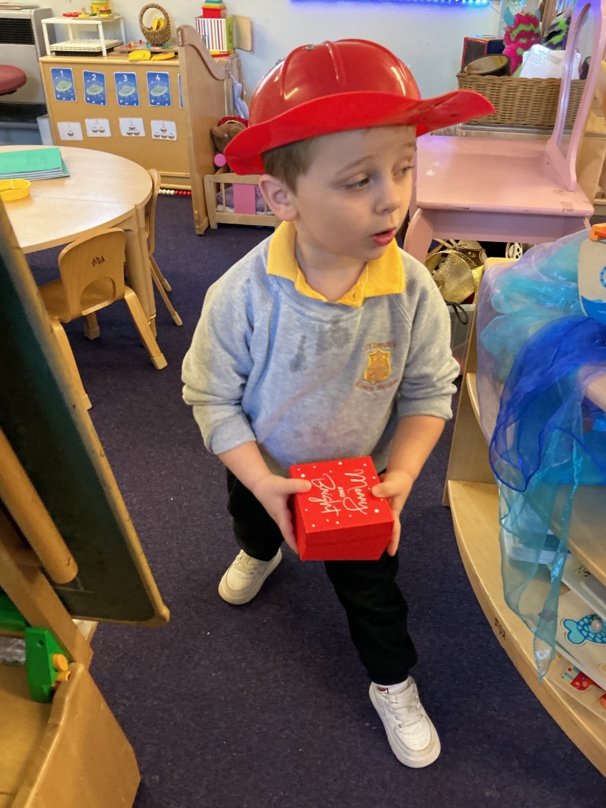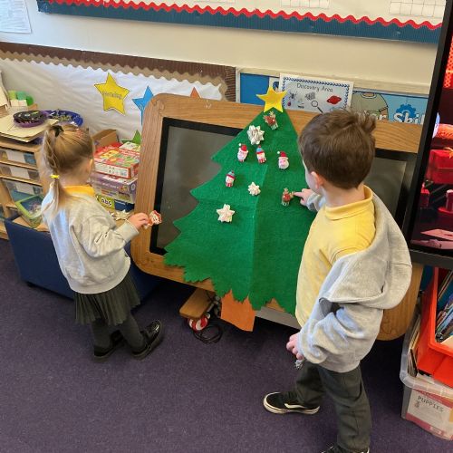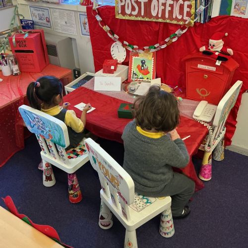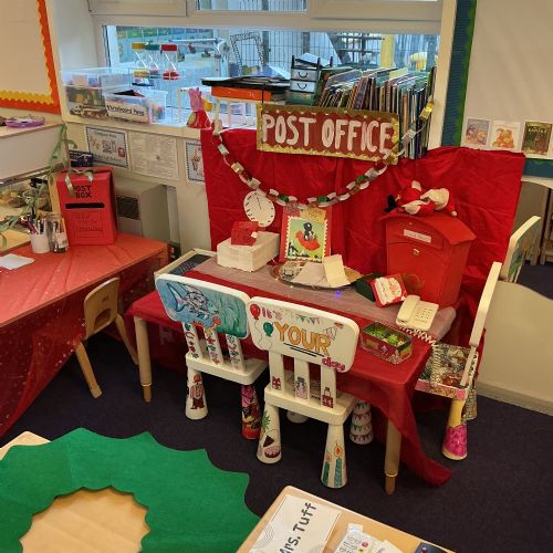 Our storybook focus this week was "The Jolly Christmas Postman!" The story really came to life because over the weekend an elf created a real post office in our classroom! It has been so fun writing and posting letters, and we especially love the stamps. This has helped us to work on our pencil grip, fine motor skills, role play and imaginary play skills. There are also so many new Christmassy things in our classroom like a Christmas tree and wreath we can decorate. Our messy Tuff Tray tested our fine motor skills too, we had to use tweezers to pull snowball pom poms off of tape.