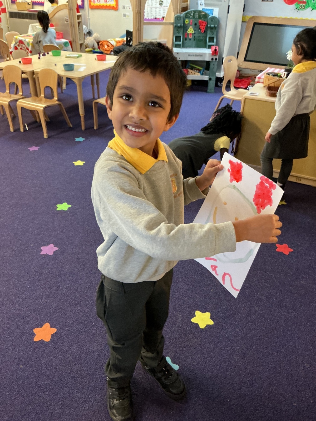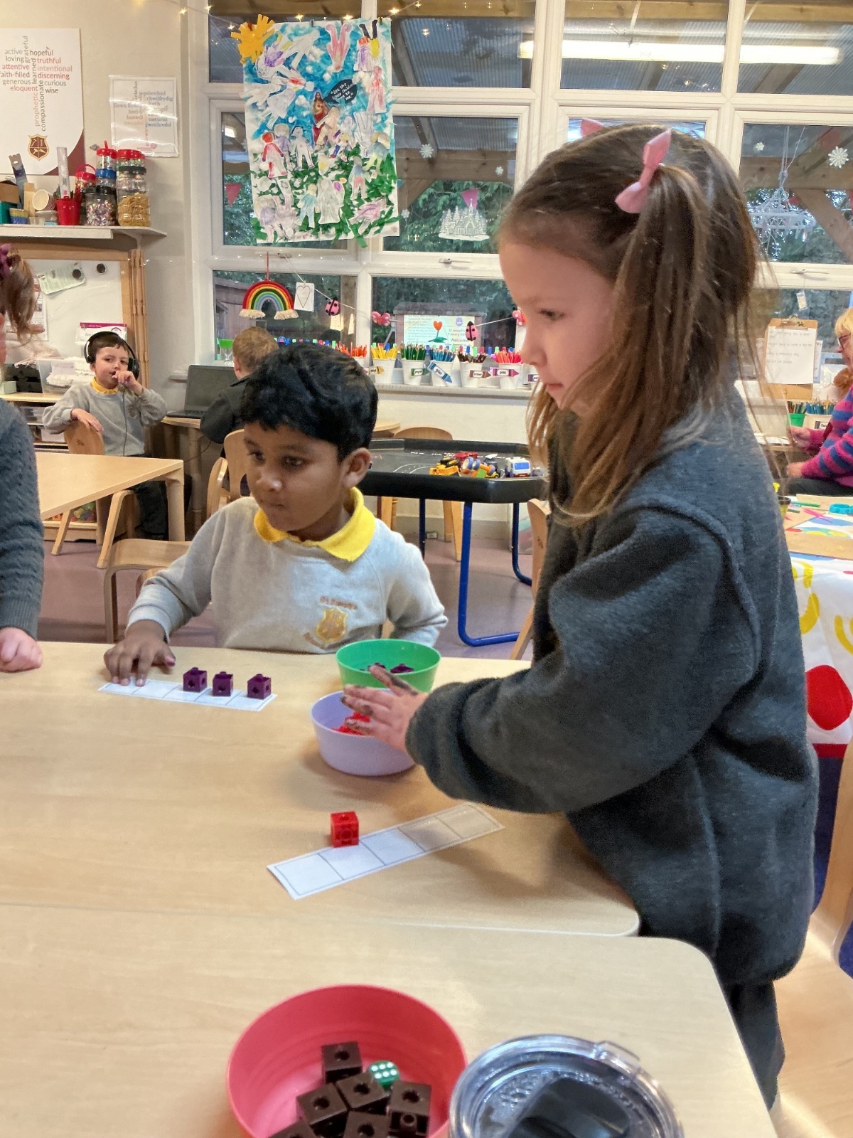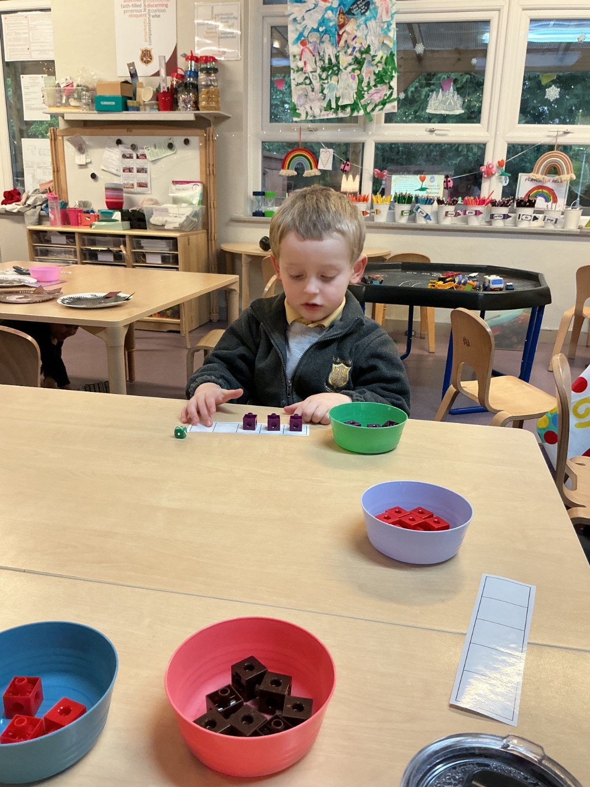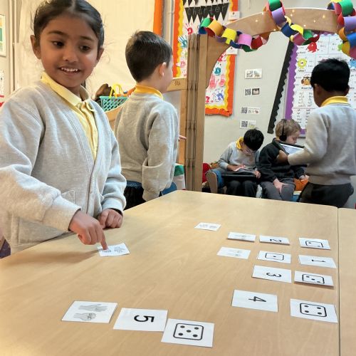 In Maths, we have been learning to use five frames and recognise how many objects are shown, up to 5 without counting. We completed a matching task in our maths books, matching the five frame to the number shown.