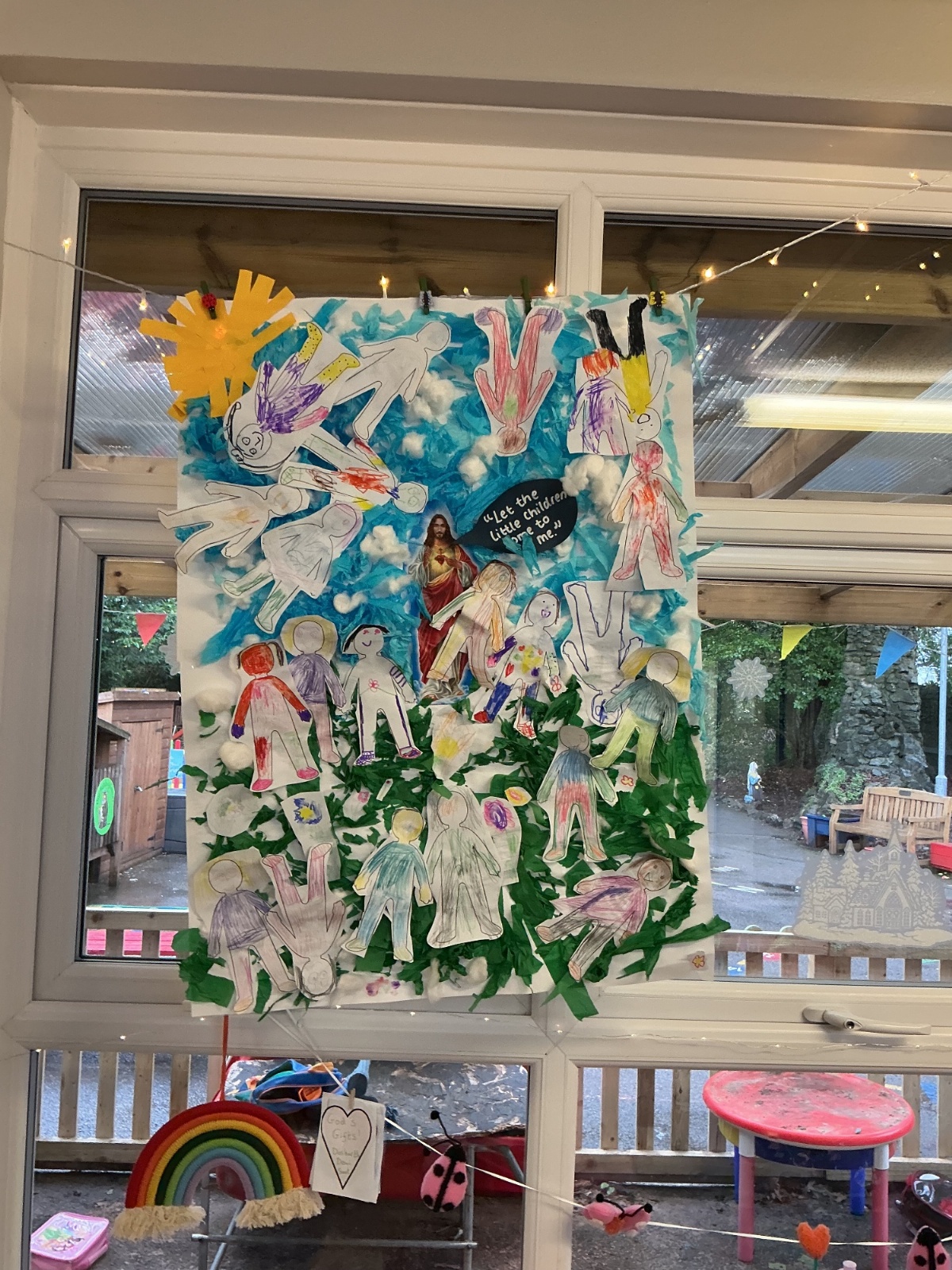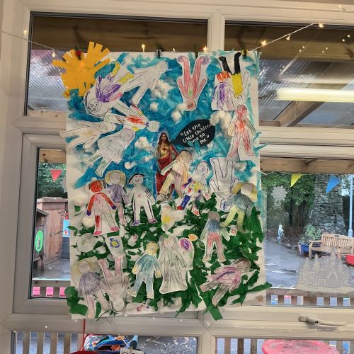This week in Religion we heard the story about Jesus welcoming the children and created a piece of art as a whole class to represent this.