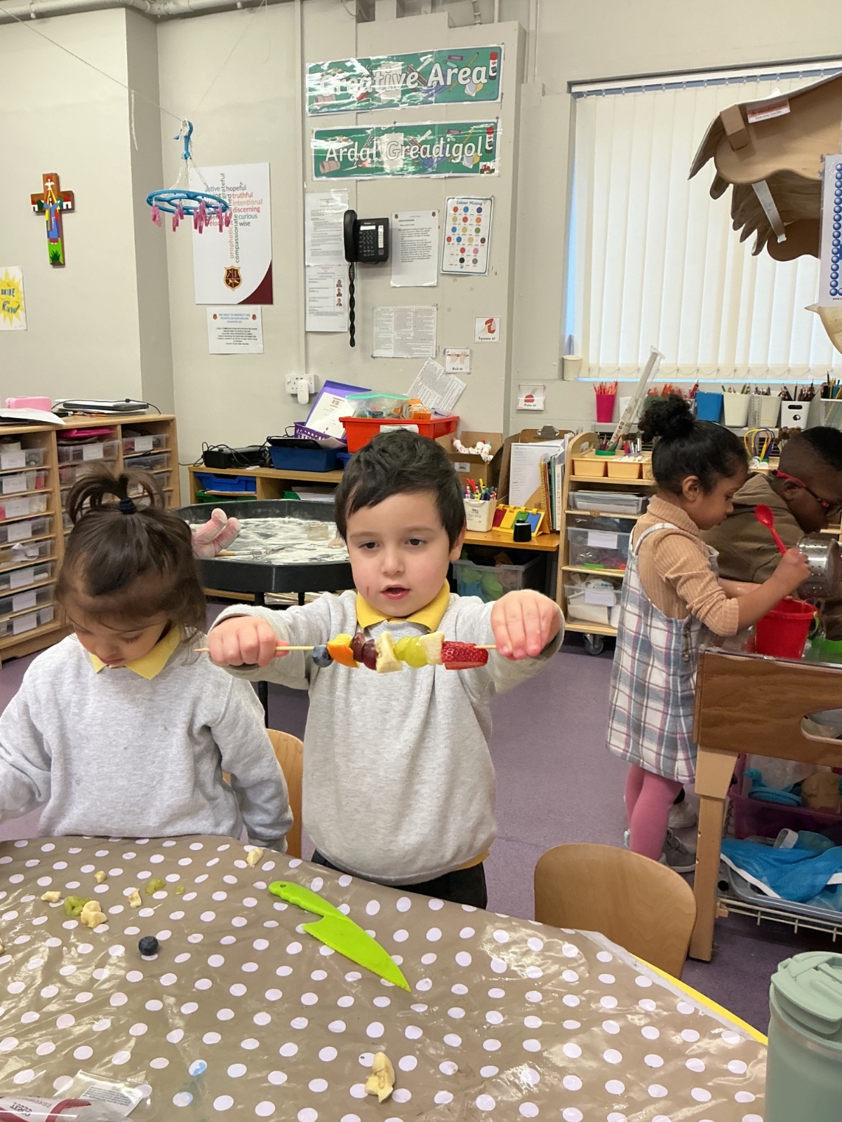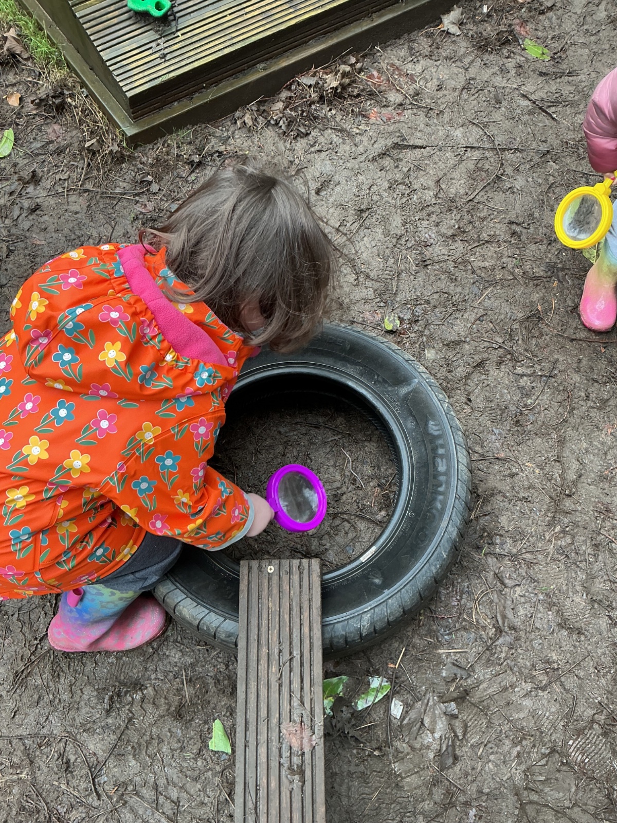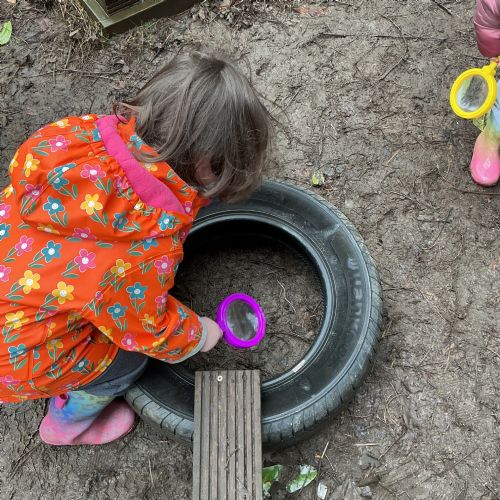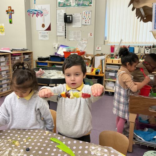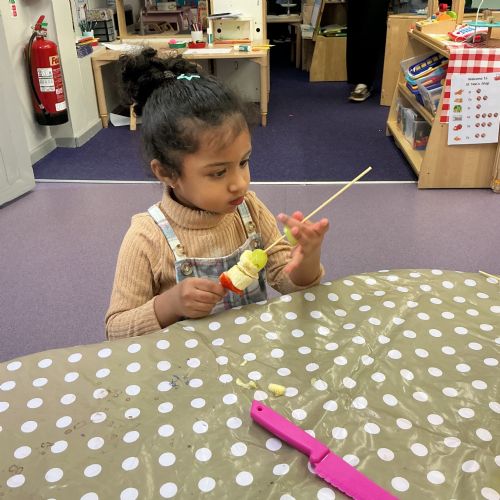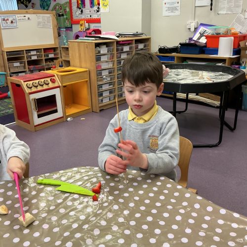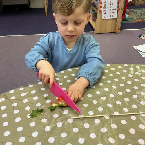 Outside, we used magnifying glasses to be outdoor sleuths, looking for colour and minibeasts in the mucky, rainy woods. To finish off our week, we made edible rainbows! (AKA fruit kebabs). We practised our cutting and skewering techniques.