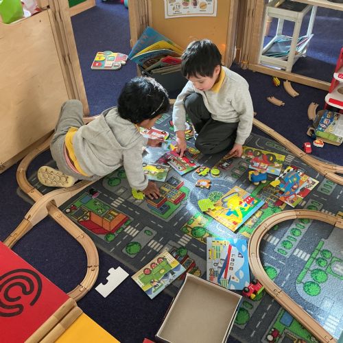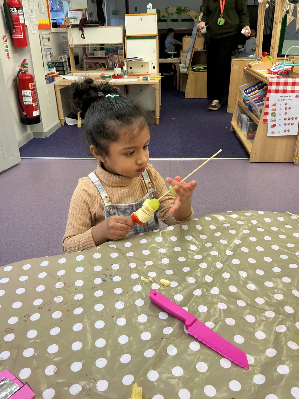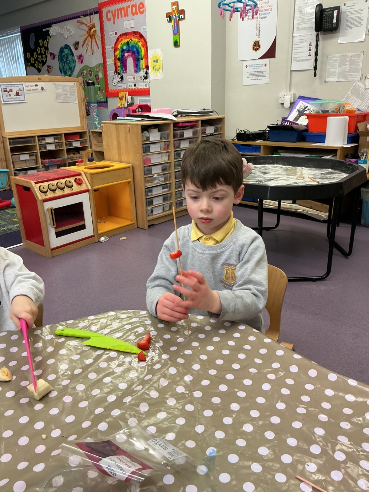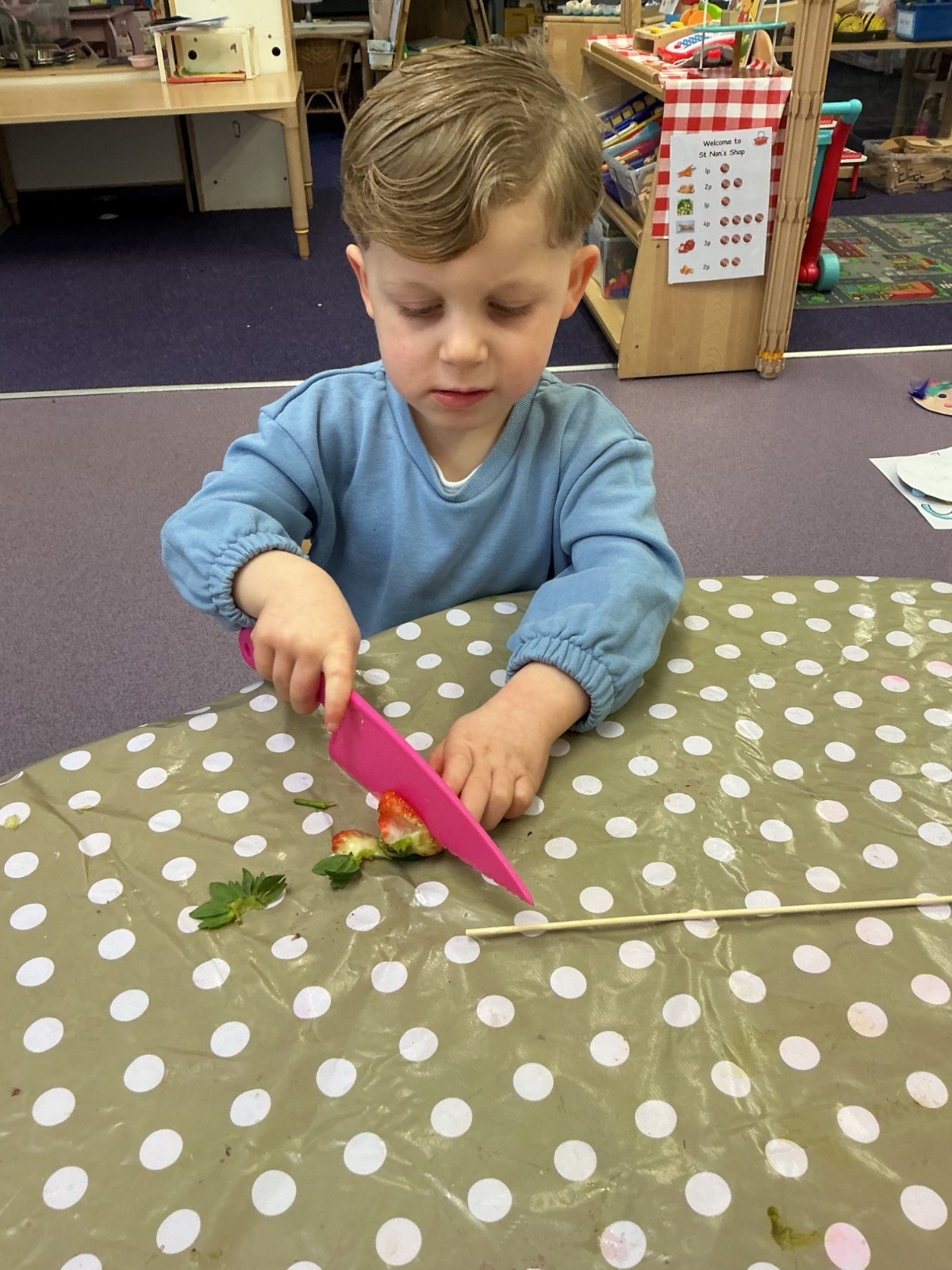 Outside, we used magnifying glasses to be outdoor sleuths, looking for colour and minibeasts in the mucky, rainy woods. To finish off our week, we made edible rainbows! (AKA fruit kebabs). We practised our cutting and skewering techniques.